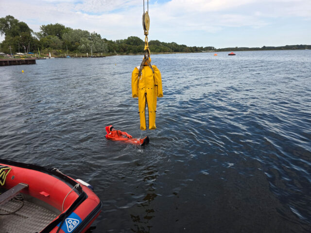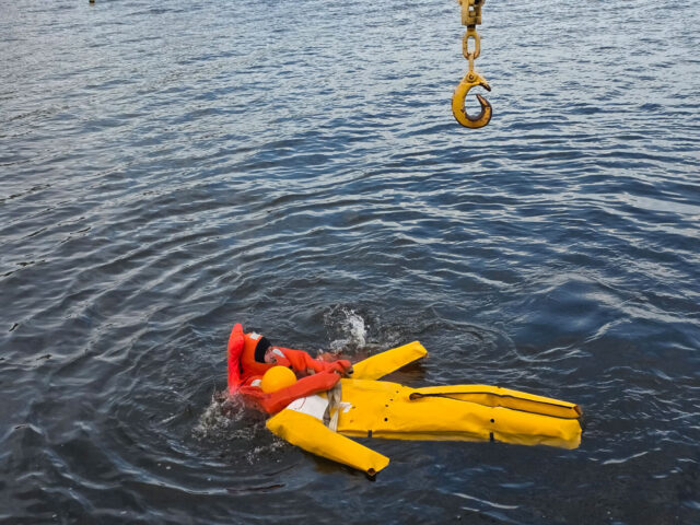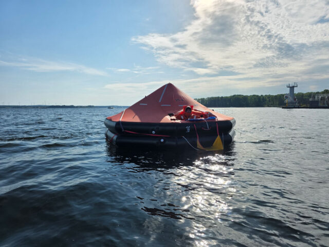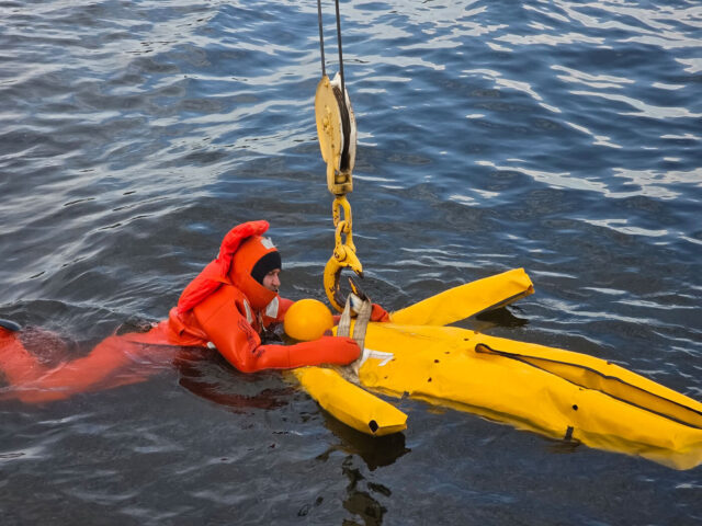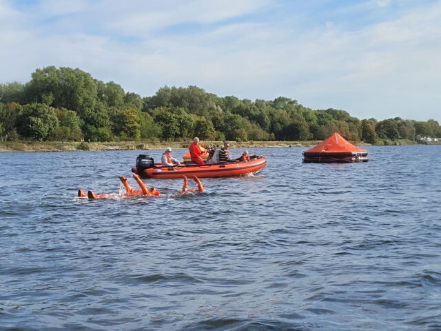 Überleben auf See – Rettungsinsel & Überlebensanzug: Trainiert wird das sichere Einsteigen in Rettungsinseln, das Anlegen und Nutzen von Überlebensanzügen sowie das Verhalten im Wasser unter Extrembedingungen.